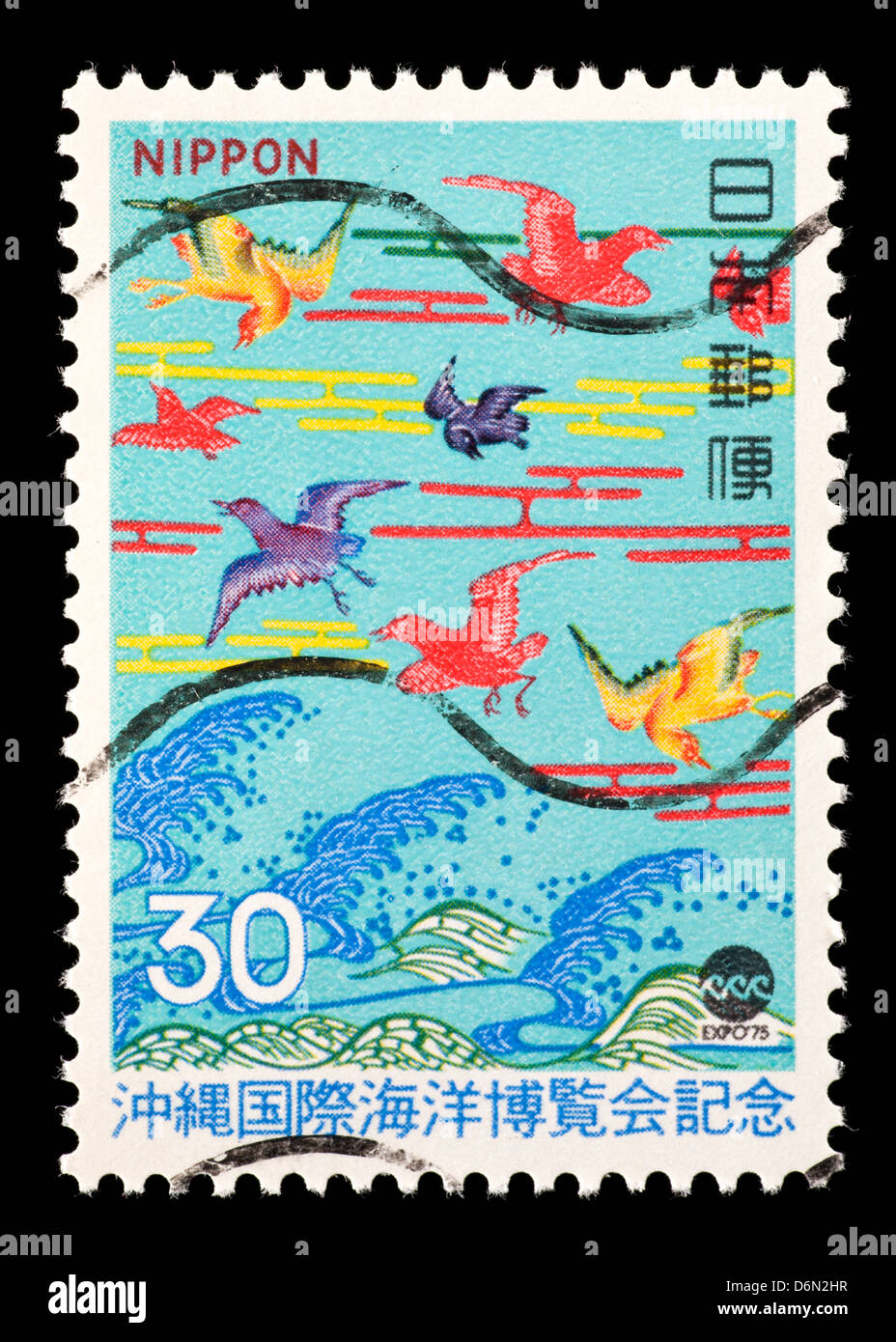 Timbre-poste du Japon représentant la peinture Oiseaux en vol par Bingata Photo Stock - Alamy